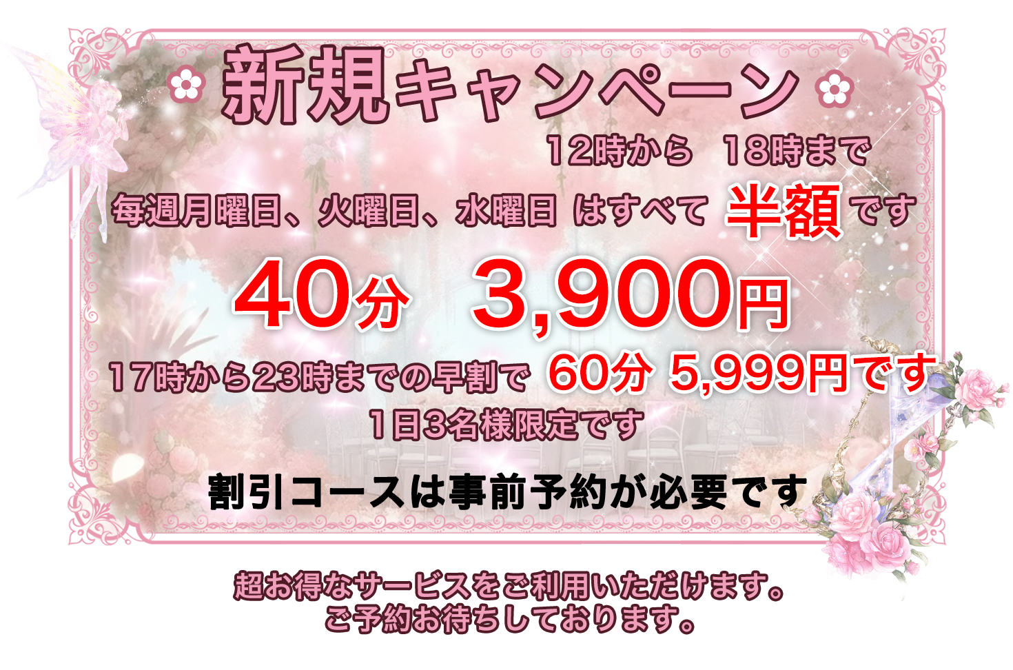 毎日頑張っている紳士の皆様、日頃の疲れになっている身体と心を、幸福なる雰囲気包まれた癒しの場所、落ちついた部屋の個室で可愛いセラピスト達がお待ちしております。当店のセラピストは若く容姿端麗にこだわりました、まるで蜜のように甘く幸せな空間でゆったりとした時間をお過ごし下さい。